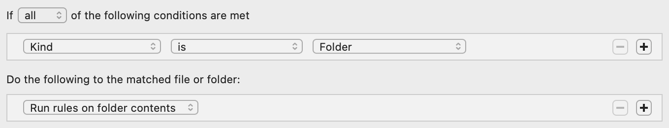 The first rule, which tells Hazel to process subfolders , looks like this: