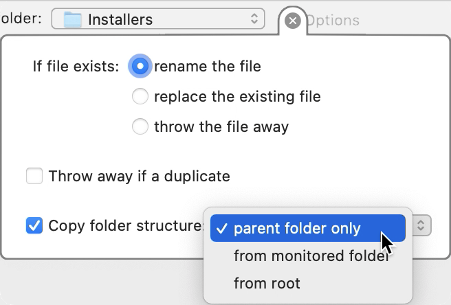 icon in the action, select “Copy folder structure,” and then choose the structure you prefer from the pop-up menu, as shown below. (By default, this option is disabled and no folder structure is copied, which means any file or folder processed by your rule is placed at the top level of the destination folder.)