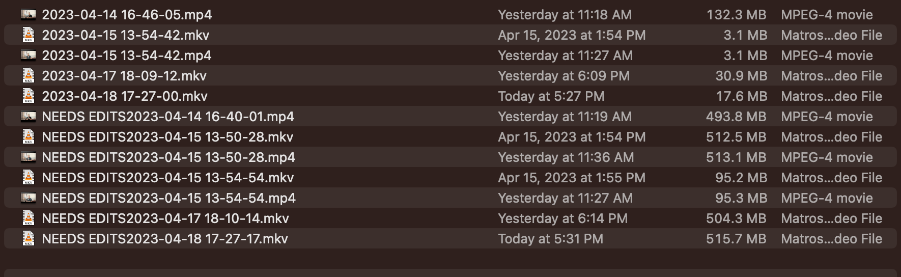 Any help would be great! I record using OBS and I use a streamdeck to trigger a screenshot whenever I make a mistake. But if I do multiple recordings, this can get messy. Separating the files to different folders based on type cleans it up but then I need to cross reference the names of the screenshot and recording to know if I need to edit the video or not. By having Hazel add a modify the video file (by tagging or renaming), the editor can quickly see if the video requires edits. Tagging is probably better since the .mkv file is still writing when the rule needs to run.